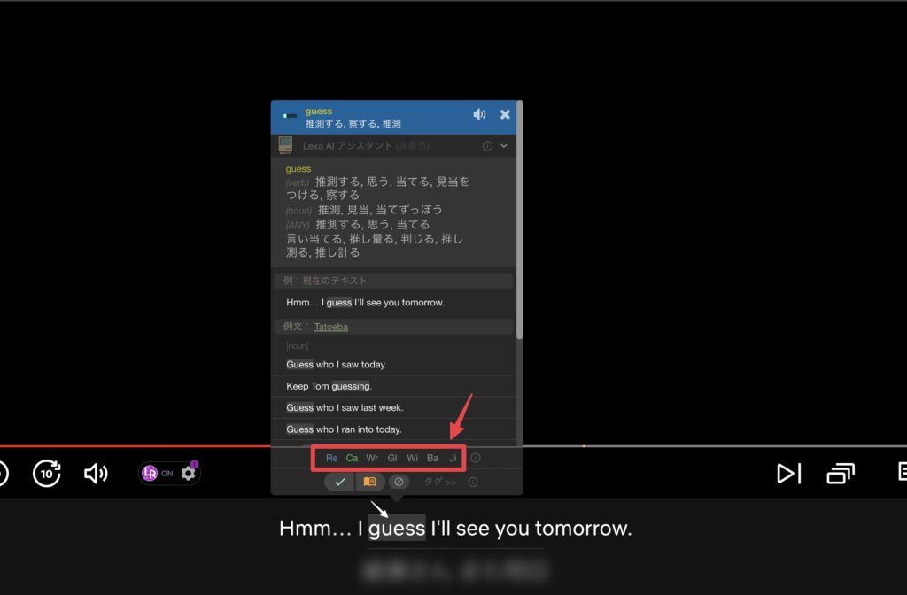 字幕にカーソルを当てるとその場で 単語の意味と例文が確認できる 画期的な機能です。